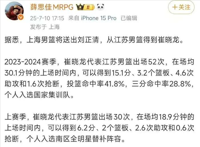 据多家权威媒体透露,上海男篮新赛季首笔引援正式敲定,曾入选过中国男篮集训队的后卫崔晓龙将正式披上上海男篮战袍,在这笔交易中,上海久事将队中年轻后卫刘正清作为筹码给到崔晓龙母队江苏肯帝亚,并向江苏方面支付了数额不菲的培养费。崔晓龙虽然不属于CBA里的顶级国产后卫范畴,但身高臂长,能保证球队下限,常规赛作为球队1号位正常轮转完全够用,至于季后赛,大部分球队都会将球权交给小外援,崔晓龙只需要将球顺利运过前场即可。