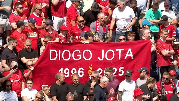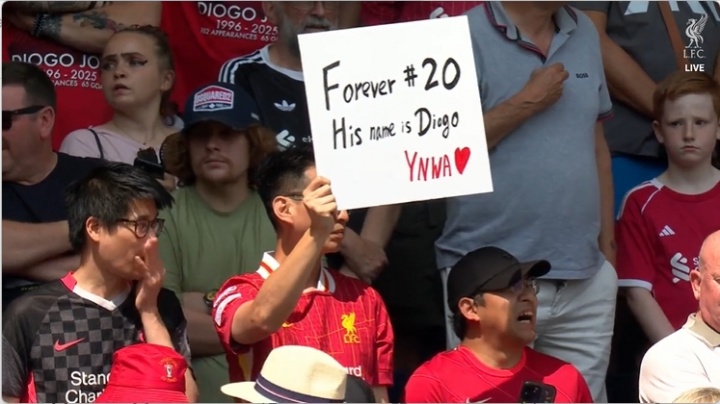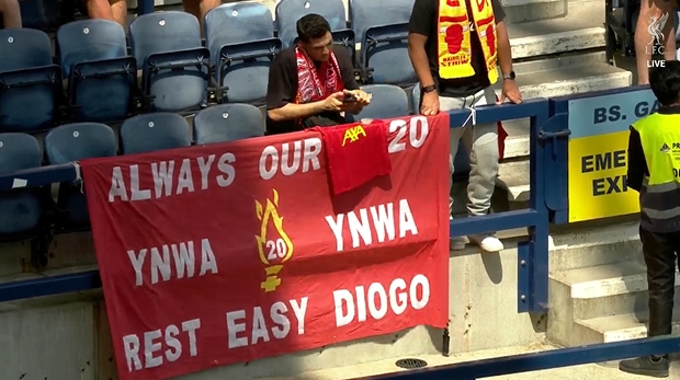 利物浦球迷在看台拉出横幅,表示对若塔兄弟的深情悼念